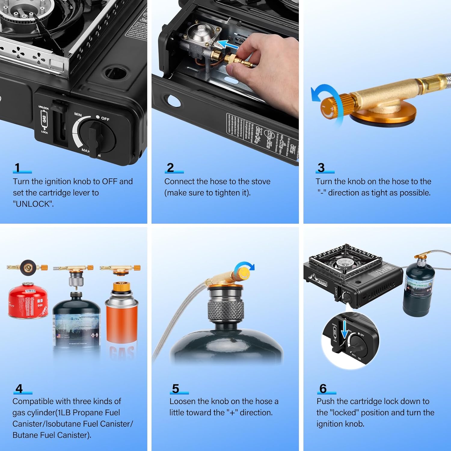 Constructed with durable stainless steel materials, this gas camp stove is built to withstand the rigors of outdoor use, making it a reliable and long-lasting investment for your outdoor cooking adventures. The included carrying case makes it easy to transport and store the stove, while the stainless steel hose adapters ensure a secure and leak-free connection to your fuel source.